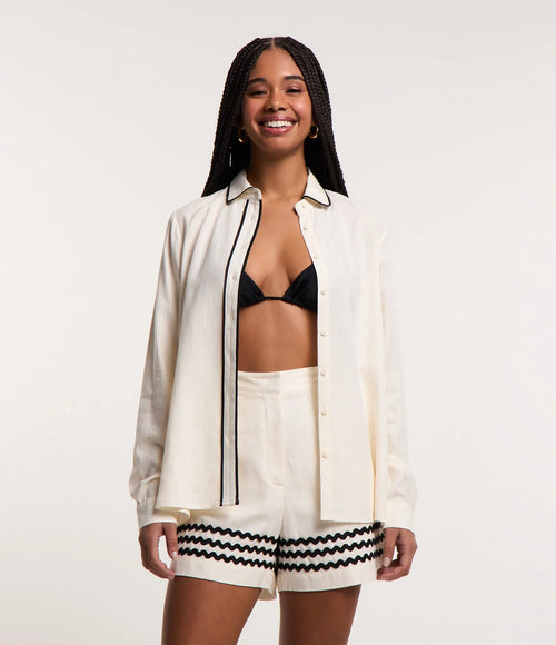 Camisa Alongada em Viscose e Linho com Detalhe Contrastante Off White